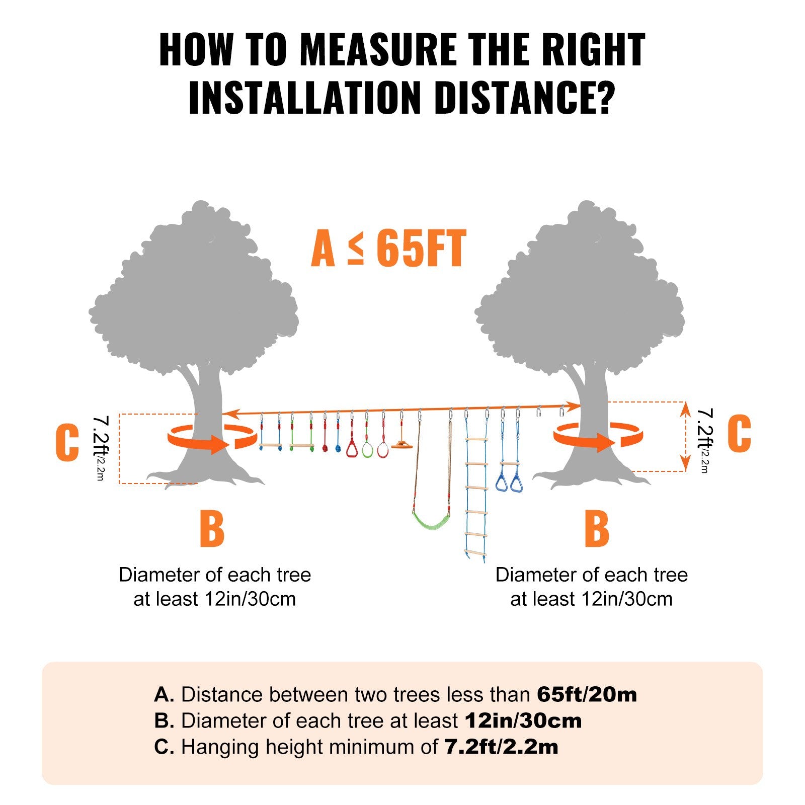 The outdoor playset equipment can be assembled in just 5 minutes. There's no need for a wide flat area in your yard; just fix it between two trees or poles 20 to 40 feet apart to start customizing your obstacle challenge game! It's an ideal alternative to traditional playgrounds, offering a convenient and flexible backyard challenge game for children of various ages and skill levels.